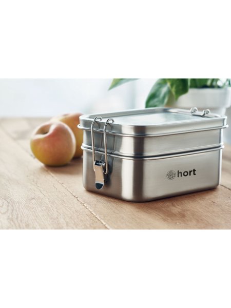 Lunch box en acier inoxydable 2 compartiments avec des fermetures latérales solides et sûres. Contenance 1200 ml.