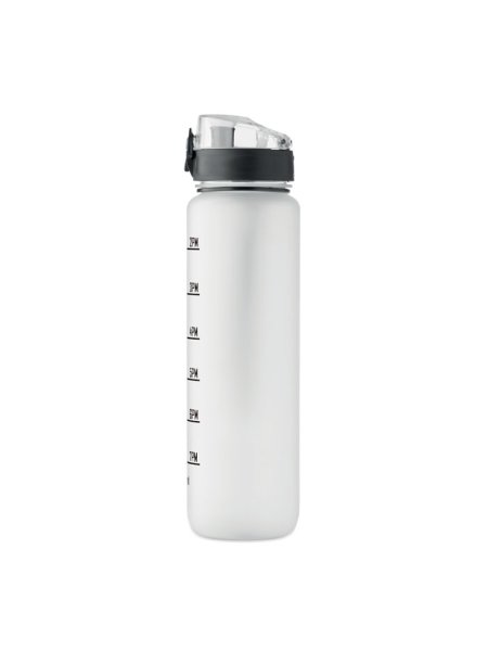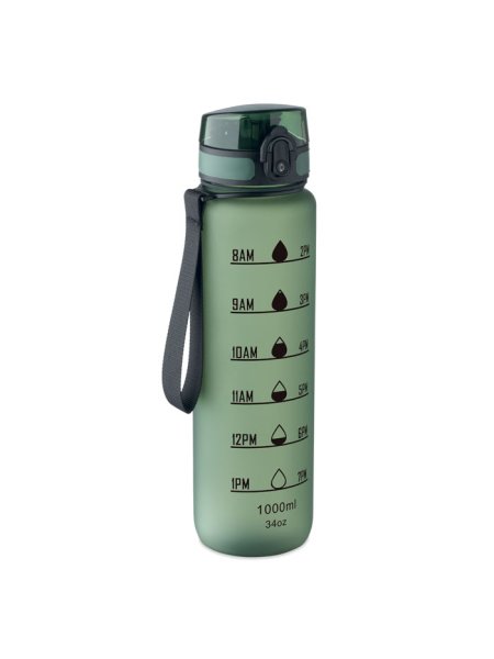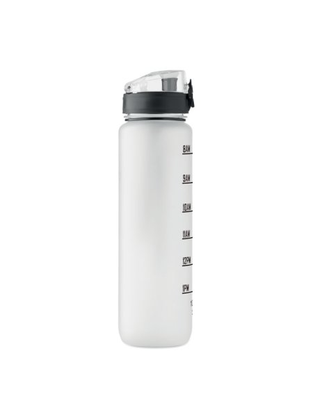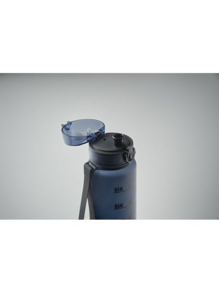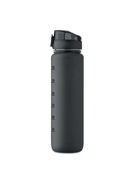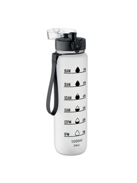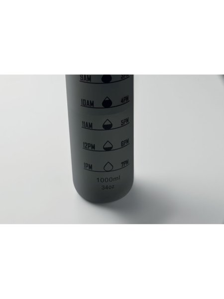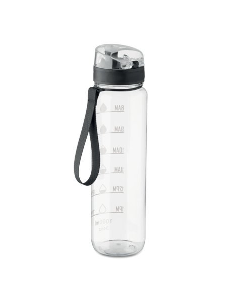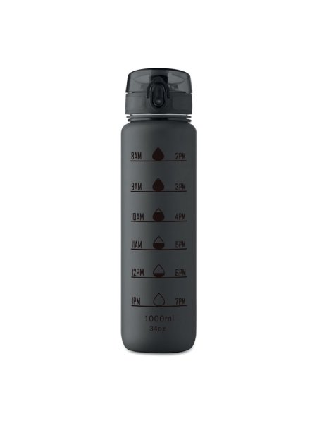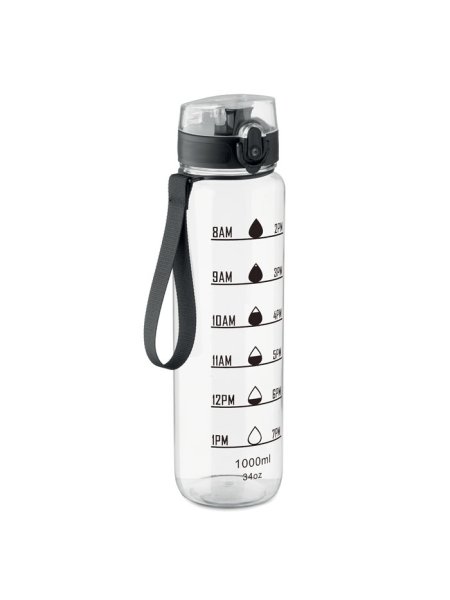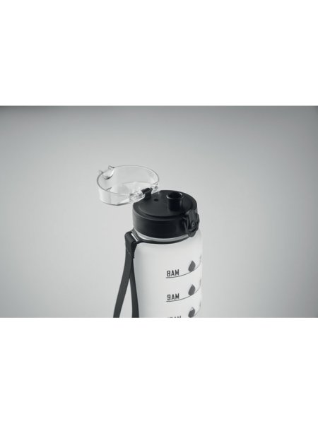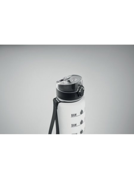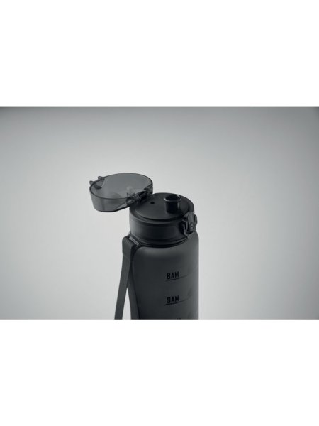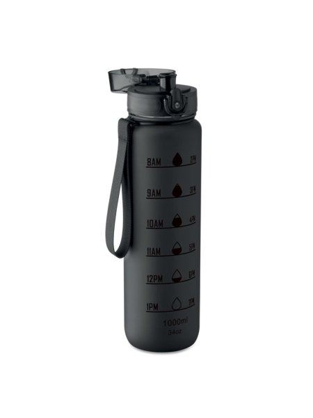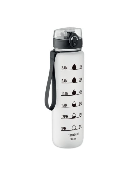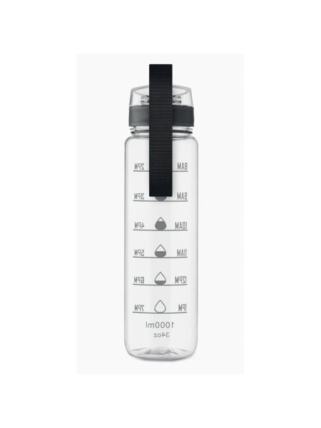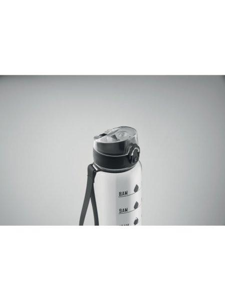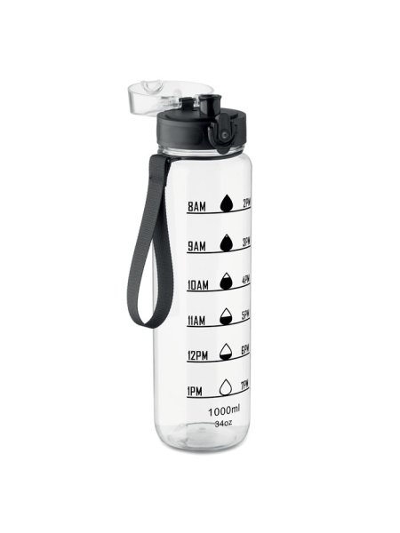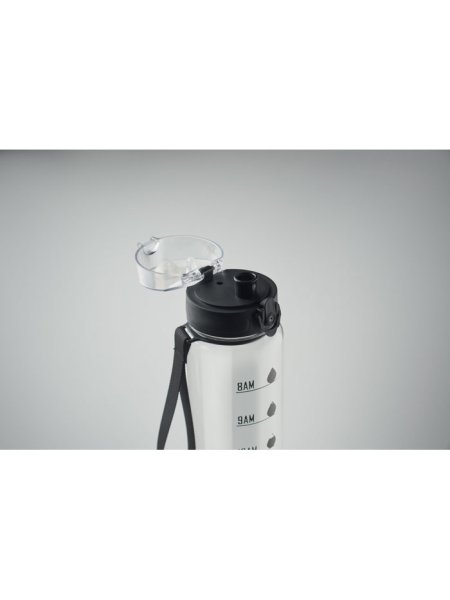 Bouteille de sport en RPET, marqueurs de temps motivants, couvercle à ouverture d'une seule main, fermeture de sécurité et sangle de transport. Anti fuite. Capacité : 1 litre.