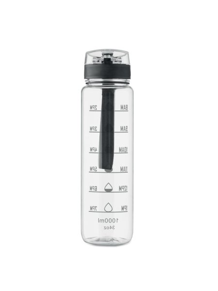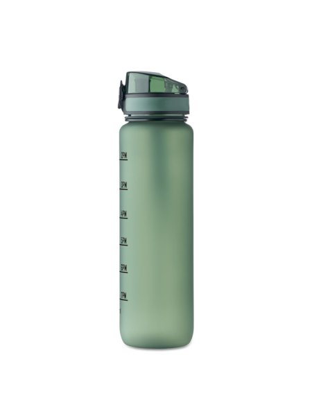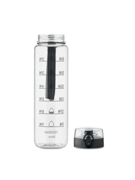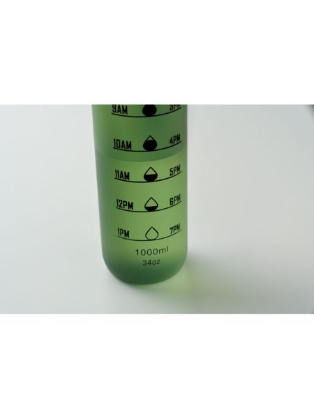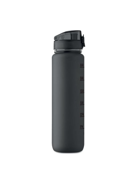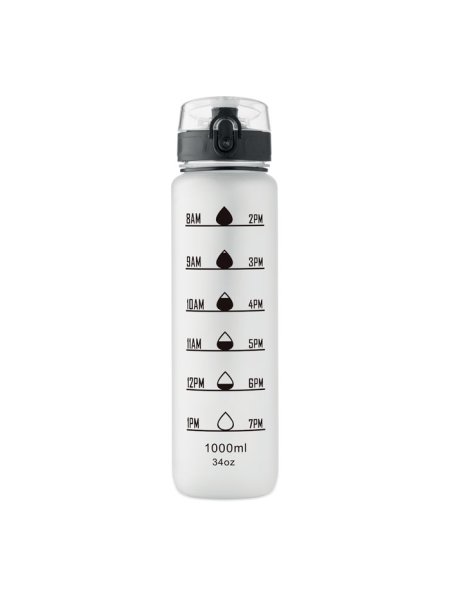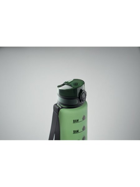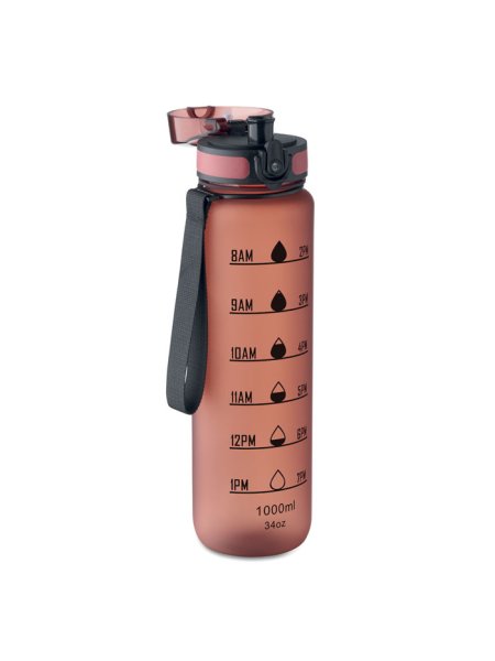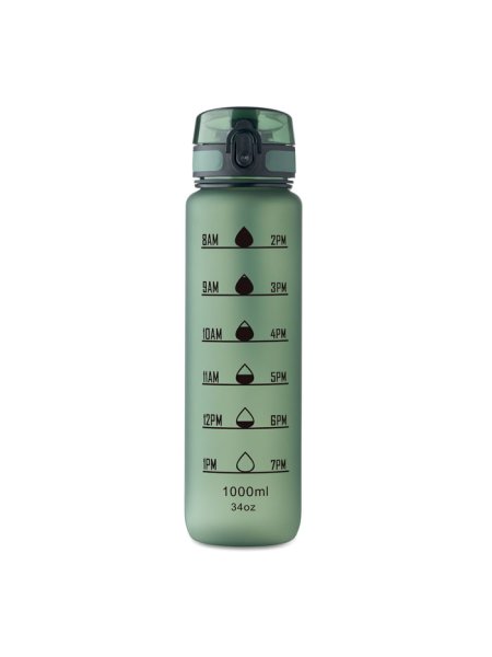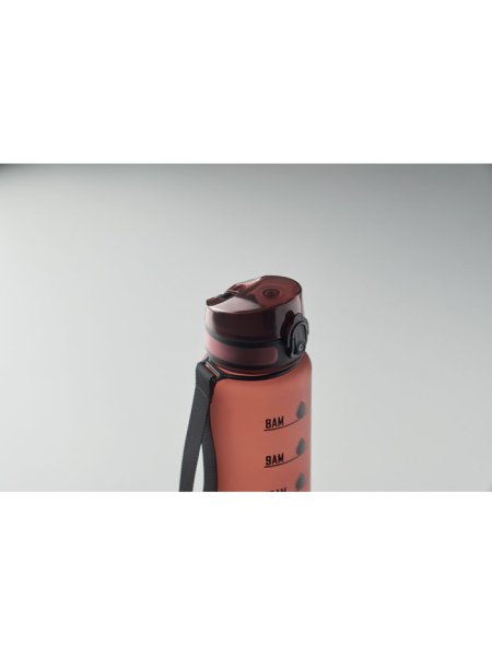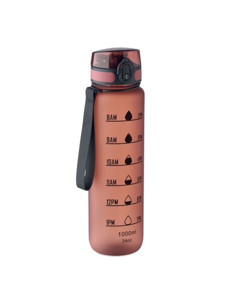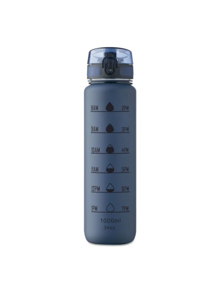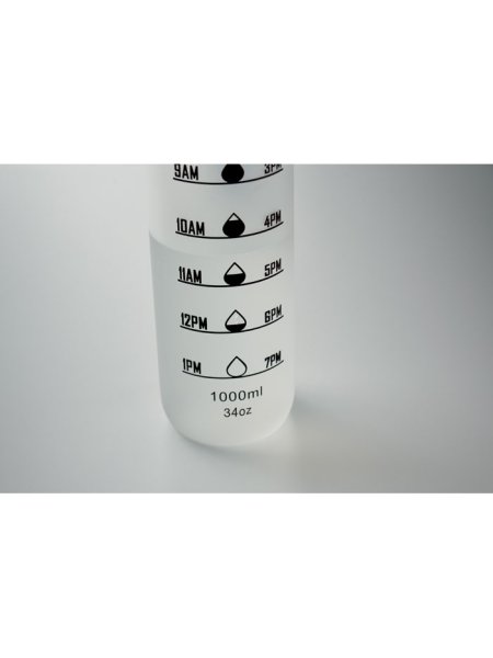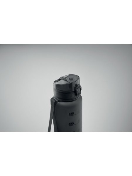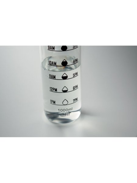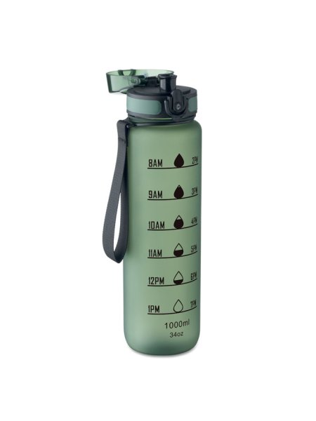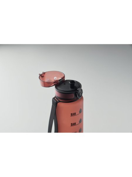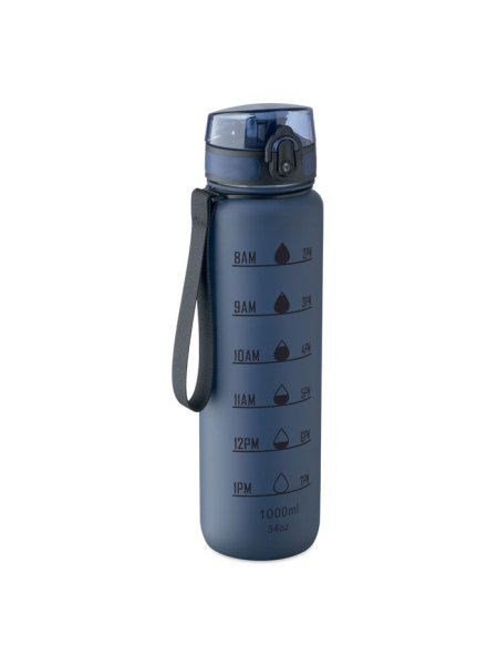 Bouteille de sport en RPET, marqueurs de temps motivants, couvercle à ouverture d'une seule main, fermeture de sécurité et sangle de transport. Anti fuite. Capacité : 1 litre.