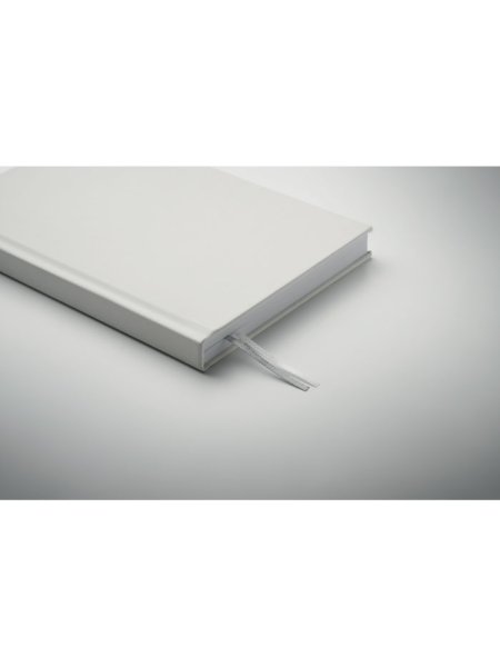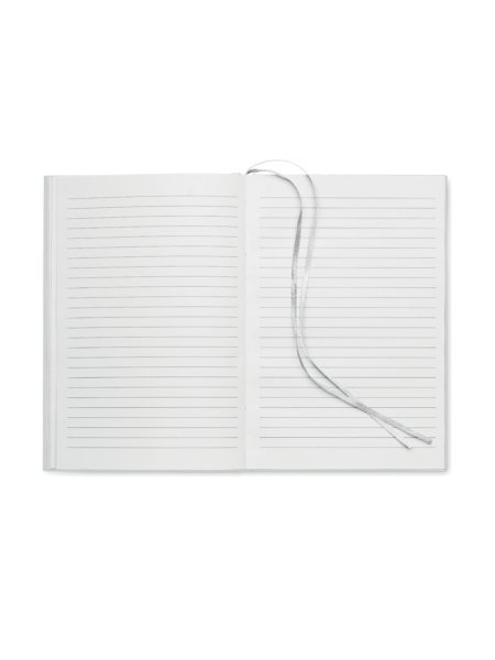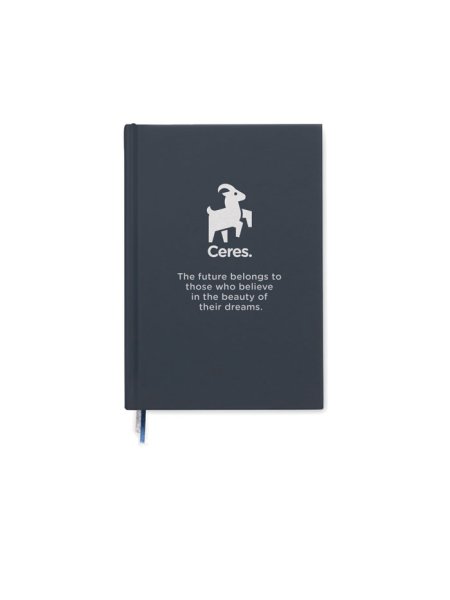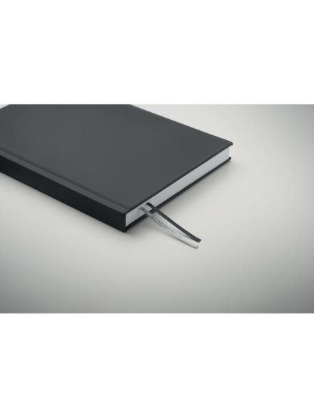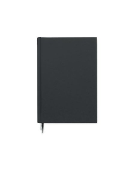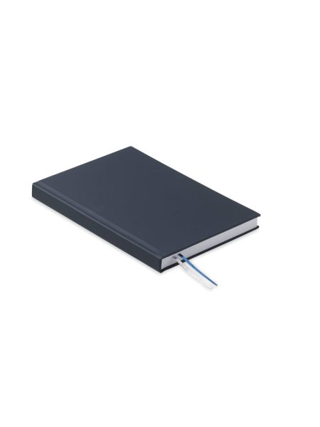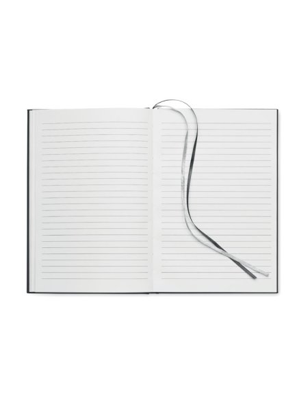 Carnet A5 en polyester post-consommation recyclé à 60 % et couverture en PU à 40 %. Reliure dos collé. 256 pages lignées en papier recyclé 70gr/m² (128 feuilles). Avec 2 rubans marque page.
