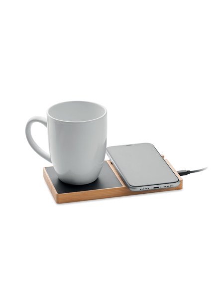 Chargeur sans fil en bambou comprenant un chauffe-tasse et un support pour téléphone. Connectez votre appareil à votre ordinateur, placez votre smartphone sur le support et laissez-le se charger. Sortie : DC 9V/1.67A (15W). Compatible avec les derniers androïdes, iPhone® 12, X et plus récents.