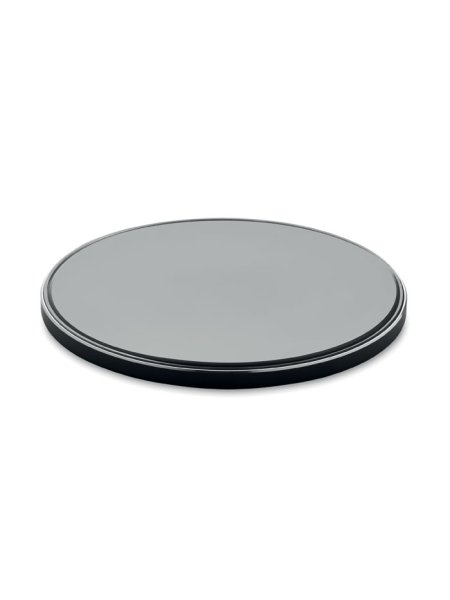 Chargeur sans fil en aluminium 10W avec verre sur le dessus. Lumière bleue lors de la charge. Sortie : DC 9V/1.1A. Compatible avec les derniers androïdes, iPhone® 8, X et plus récents.