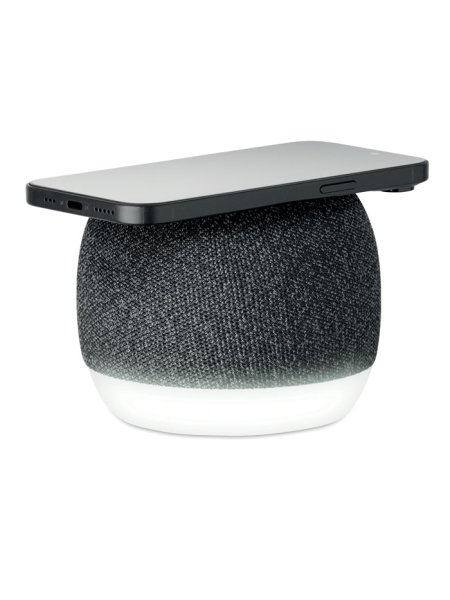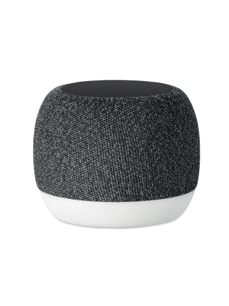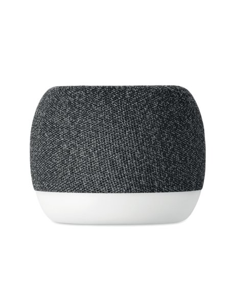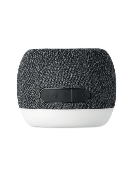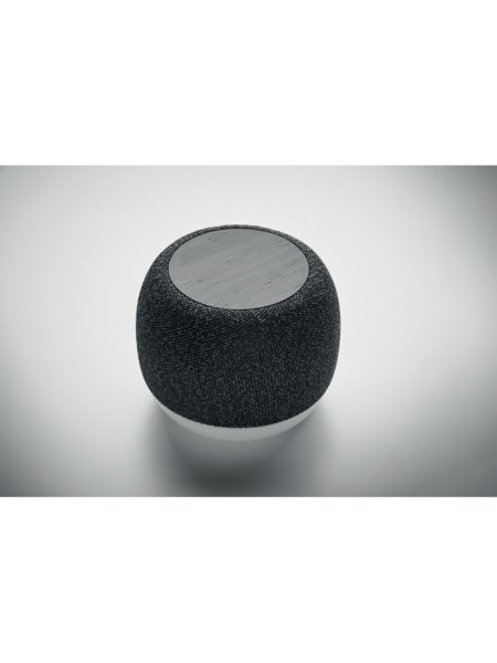 Haut-parleur 5.0 sans fil en ABS et tissu RPET avec détails en bambou sur le dessus, base lumière d'ambiance. Batterie rechargeable Li-ION 1200 mAh, port pour carte SD, câble AUX/USB inclus. Données de sortie : 5W, 3 Ohm et 5V. Durée de lecture : environ 3 heures.