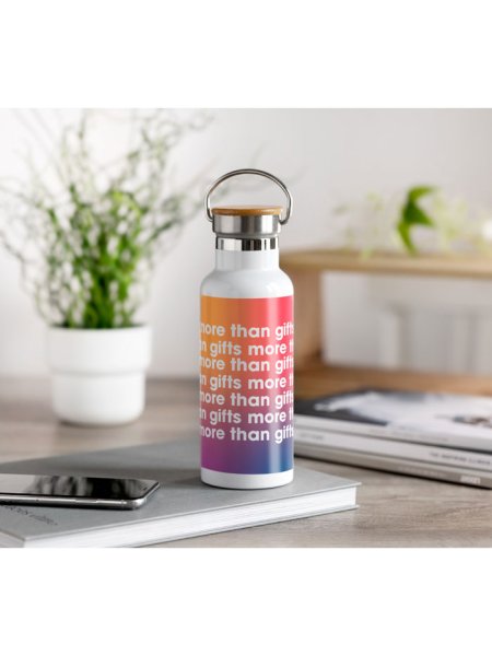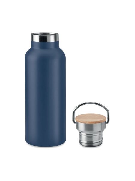 Bouteille isotherme à double paroi en acier inoxydable avec bouchon en bambou et poignée. Contenance 500 ml. Anti fuite. Le bambou est un produit naturel, et présente de légères variations de couleur, de décoration et de tailles.
