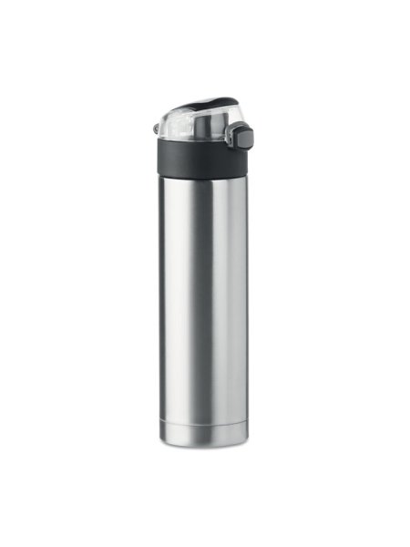 Gourde double paroi en acier inoxydable avec verrou de sécurité sur le couvercle et ouverture par pression. Poignée pliable sur le dessus pour faciliter le transport. Contenance 400 ml. Anti fuite.