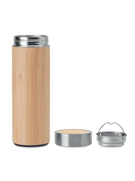 Gourde double paroi Inox avec couvercle isolant en bambou et infuseur à thé. Contenance 400 ml. Le bambou est un produit naturel, et présente de légères variations de couleur, de décoration et de tailles.