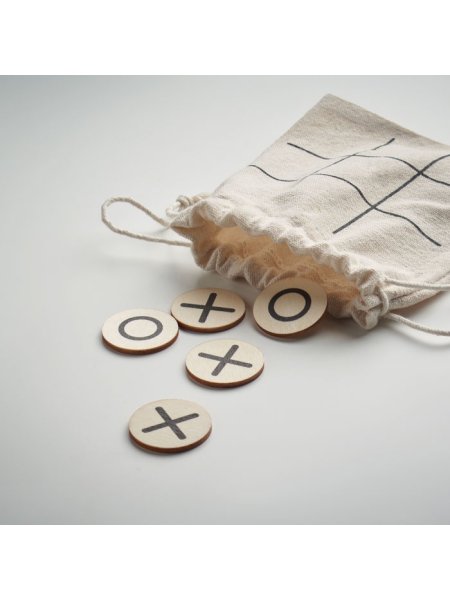 Jeu de morpion en bois. Présenté dans une pochette en coton. Le bois est un produit naturel, et présente de légères variations de couleur, de décoration et de tailles.