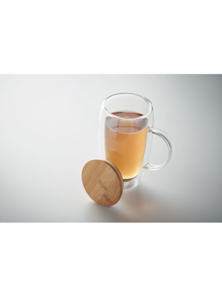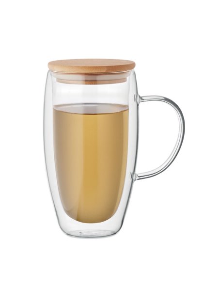 Mug en verre borosilicate double paroi avec poignée et couvercle en bambou. Capacité : 450 ml.