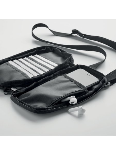 Sacoche pour smartphone en polyester 300D RPET avec bandoulière réglable. Poche frontale et latérale zippées. Le compartiment principal comporte plusieurs poches. Toutes tailles de smartphone.