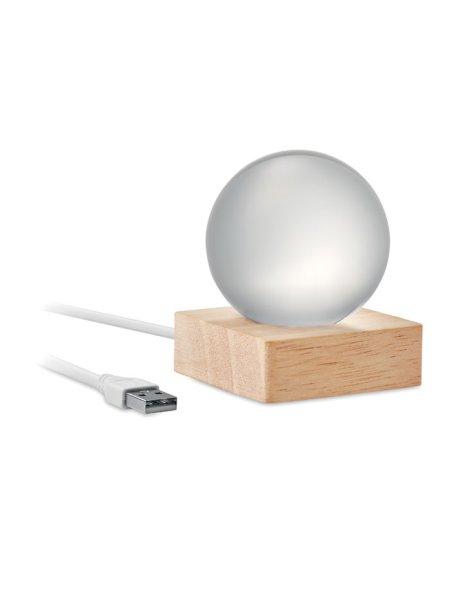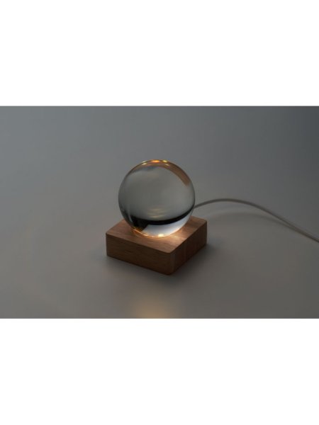 Boule de verre avec lumière LED (100 lumens) sur une base en bois d’hévéa. Comprend un câble de chargement USB (90 cm).