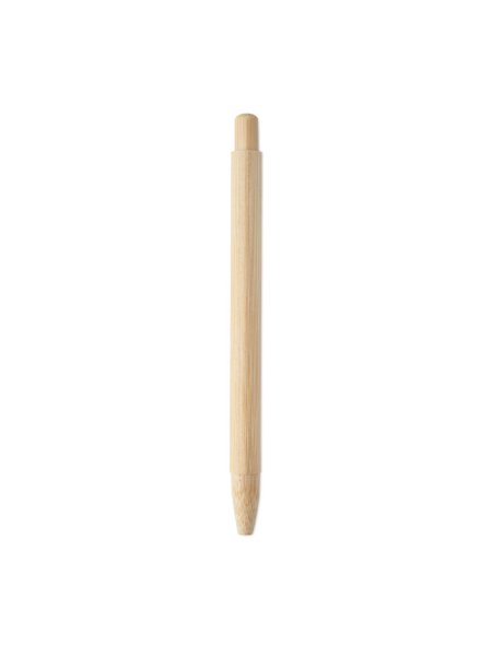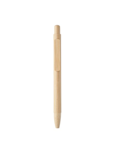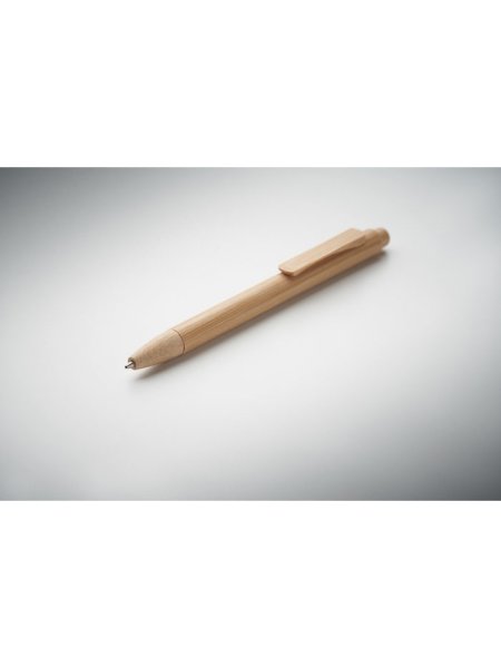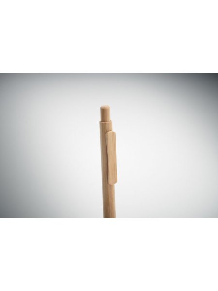 Stylo à bouton poussoir avec corps, pointe et clip en bambou. Encre bleue.