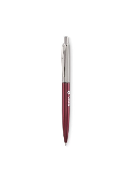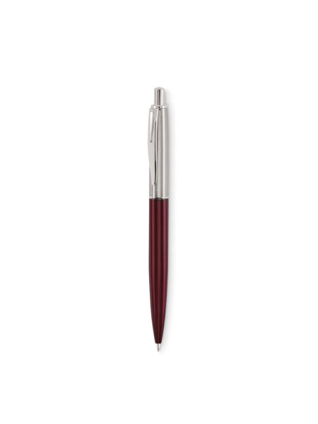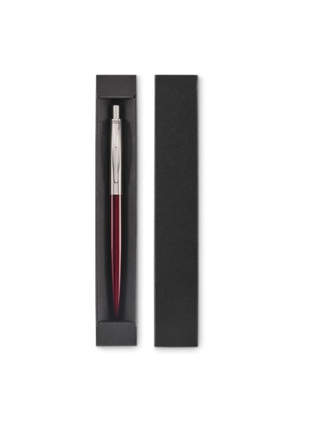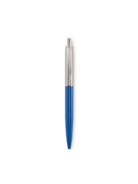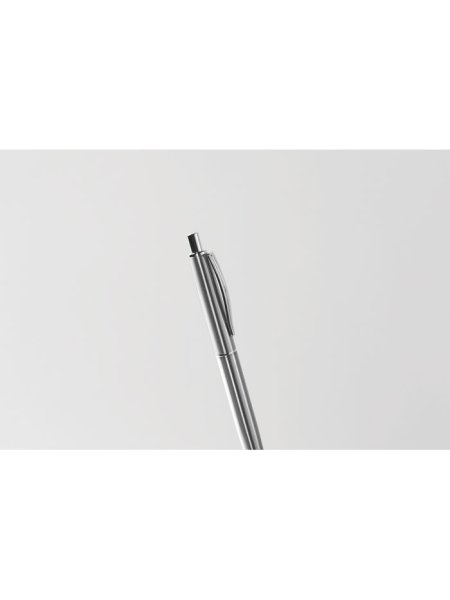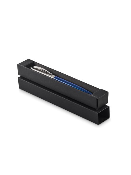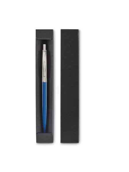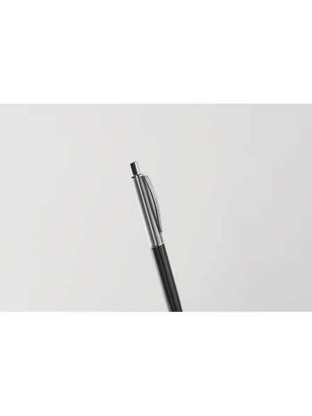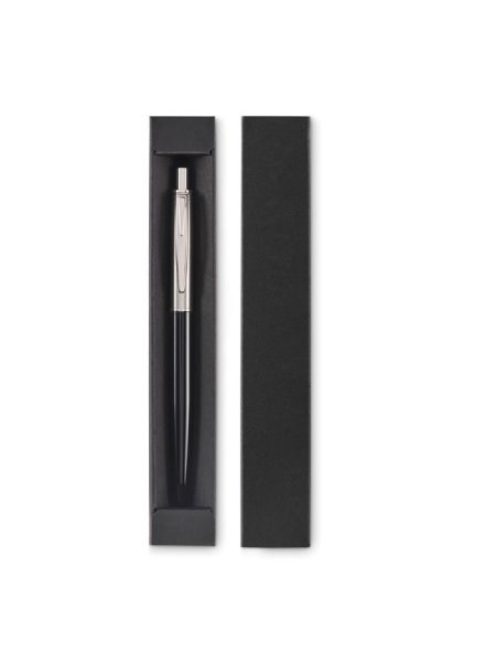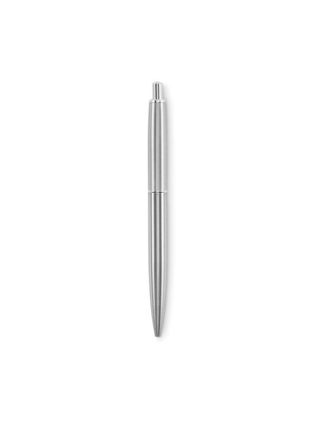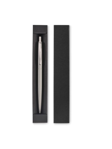 Stylo à bille à bouton poussoir dans un corps en acier inoxydable recyclé. Encre bleue. Présenté dans une boîte noire.
