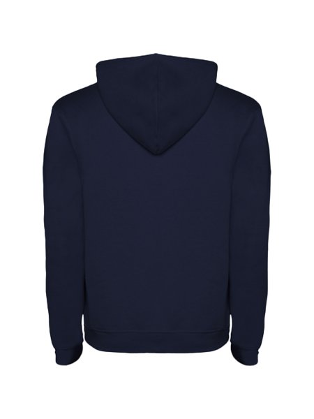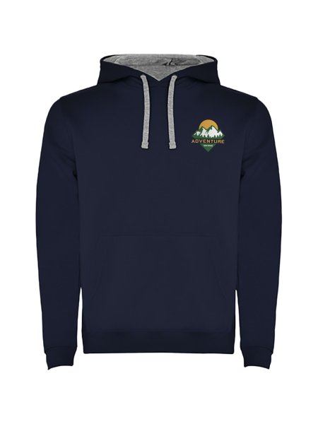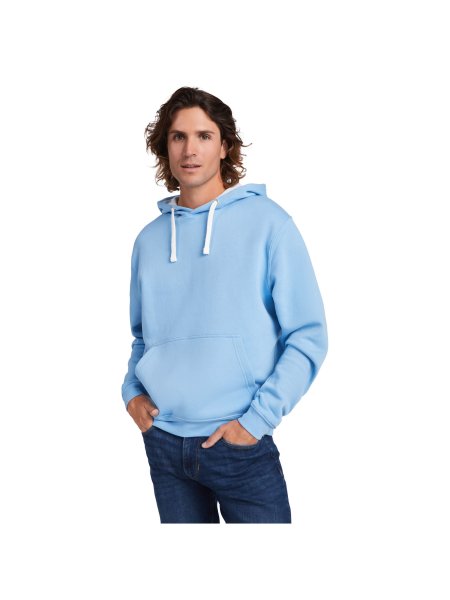 Sweat à capuche bicolore avec double tissu, cordon de serrage réglable contrasté, coutures recouvertes renforcées au col et poche style kangourou. Côte 1x1 élasthanne aux poignets et à la taille. Étiquette détachable. Le mannequin mesure 185 cm et porte la taille M.